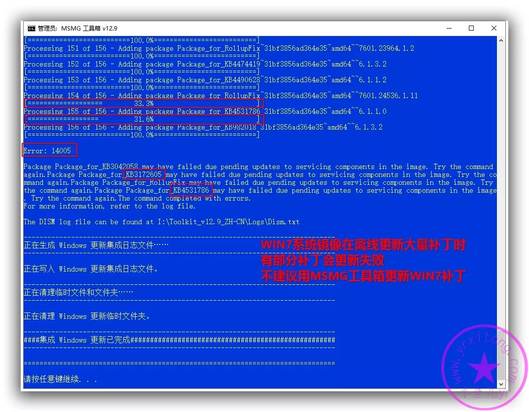 结果好几个补丁安装失败,浪费了小鱼儿yr差不多一个小时。所以在集成大量的WIN7补丁时不推荐MSMG Toolkit工具。为了避免重蹈覆辙,建议使用NTLite集成补丁,NTLite在大批量集成补丁时,会自动排序,会自动判断哪些补丁需要先安装,哪些需要后安装,并且会判断哪些补丁已经安装了,而无需重复安装,从而最大程度避免出错。毕竟MSMG是免费的,还是用付费的NTLite集成补丁更稳妥一点。